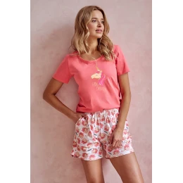 Dámske bavlnené pyžamo, tričko s krátkym rukávom a potlačou, doplnené krátkymi vzorovanými šortkami s vreckami.