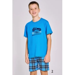 Chlapčenské bavlnené pyžamo, tričko s krátkym rukávom a potlačou, doplnené krátkymi károvanými šortkami.
