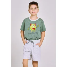 Klasické chlapčenské pyžamo s krátkymi rukávmi, vyrobené z bavlny, tričko s farebnou potlačou na prednej strane, okrúhly výstrih. Doplnené pevnými krátkymi šortkami s vreckami a šnúrkou na stiahnutie na úpravu.