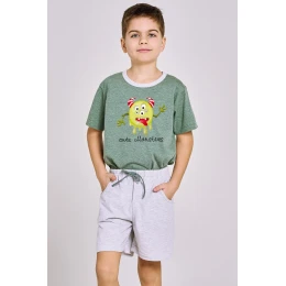 Klasické chlapčenské pyžamo s krátkymi rukávmi, vyrobené z bavlny, tričko s farebnou potlačou na prednej strane, okrúhly výstrih. Doplnené pevnými krátkymi šortkami s vreckami a šnúrkou na stiahnutie na úpravu.