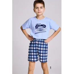 Chlapčenské bavlnené pyžamo, tričko s krátkym rukávom a potlačou, doplnené krátkymi károvanými šortkami.