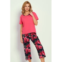 Dámske pyžamo s krátkymi rukávmi z mäkkej bavlny, jednofarebná blúzka s výstrihom a 3/4 dlhé vzorované nohavice.
