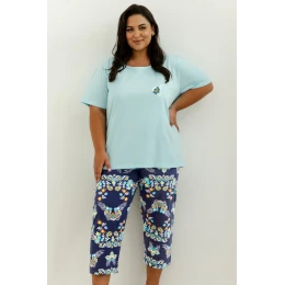 Dámske pyžamo s krátkymi rukávmi z mäkkej bavlny, potlač vpredu, okrúhly výstrih, vzorované nohavice v 3/4 dĺžke na doplnenie súpravy.