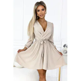 Bindy - ženské a elegantné šaty s obálkovým výstrihom, zaväzovaním v páse a gumičkami na rukávoch. farba: béžová. poľská výroba. značka numoco.