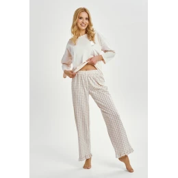 Dámske pyžamo VERA je dokonalou kombináciou pohodlia a ženského štýlu. Je vyrobené výhradne z kvalitnej 100 % bavlny, je mäkké, priedušné a príjemné na pokožku. Hladké tričko s dlhými rukávmi zdobí na hrudi jemná potlač a dopĺňajú ho dlhé nohavice v jemnom károvanom vzore, ktorých nohavice sú zakončené ozdobným volánom. Elastický pás zaručuje pohodlné nosenie bez tlaku. Súprava je ideálna na nočný odpočinok alebo večerné relaxovanie doma.