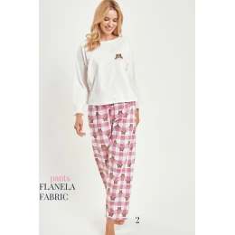 Dámske pyžamo Astrid 3441 je ideálne na chladnejšie noci. Je vyrobené zo 100 % mäkkej, priedušnej bavlny a poskytuje prirodzené pohodlie počas spánku. Vrchnú časť pyžama tvorí voľné tričko s dlhými rukávmi, okrúhlym výstrihom a jemnou potlačou na hrudi. Spodnú časť tvoria flanelové nohavice s módnym károvaným vzorom a elastickým pásom, ktorý zaručuje voľnosť pohybu a pohodlie počas celej noci.