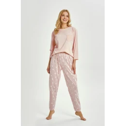Dámske pyžamo Nori 3442 je kombináciou pohodlia, elegancie a jemného šarmu. Je vyrobené zo 100 % kvalitnej bavlny, ktorá zaručuje pohodlný spánok a priedušnosť počas celej noci. Priehľadné tričko so 7/8 rukávmi má klasický polkruhový výstrih a ozdobné čipkované vrecko, ktoré mu dodáva ženský nádych. Dopĺňajú ho dlhé nohavice v tvare srdca, ktoré sú zakončené pohodlnými šnúrkami a elastickým pásom, čo je ideálne na chladnejšie večery a rána.