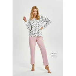 Dámsky dlhý pyžamový komplet Martina 3451 je klasický komplet pre ženy, ktoré oceňujú prírodné materiály a pohodlie každú noc. Je vyrobený zo 100 % kvalitnej bavlny, je príjemný na dotyk a priedušný. Košilka s dlhými rukávmi zdobená drobným kvetinovým motívom dodáva spodnej bielizni jemný, ženský vzhľad. Polkruhový výstrih ukončený jednotným lemovaním poskytuje estetické zakončenie. Dlhé jednotné nohavice s rovným strihom a elastickým pásom zaručujú pohodlie a voľnosť pohybu počas spánku.