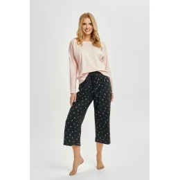 Dámske dlhé pyžamo IRENE 3457 od značky Taro je kombináciou klasiky, pohodlia a pôvabného dizajnu. Je vyrobené výlučne z prírodnej, 100 % bavlny a počas spánku poskytuje príjemný záves a priedušnosť. Tričko s dlhými rukávmi je ideálne na chladnejšie večery, zatiaľ čo nohavice s dĺžkou 7/8, zdobené jemným kvetinovým vzorom, dodávajú ženský nádych. Obopínajúci pás so šnúrkou na stiahnutie plní dekoratívnu funkciu. Ideálna voľba pre ženy, ktoré si cenia pohodlie a jemnú estetiku.