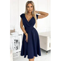 Scarlett - splývavé šaty s obálkovým výstrihom a opaskom. vyrobené z materiálu príjemného na dotyk (95% polyester, 5% elastan). farba: tmavomodrá. značka numoco. poľská výroba.
