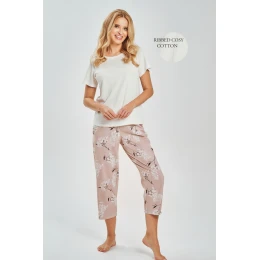 Dámske pyžamo Fiora 3539 S-XL značky TARO je vysokokvalitný poľský výrobok vytvorený pre pohodlie a prirodzenú voľnosť pri spánku. Je vyrobené zo 100 % mäkkej, priedušnej bavlny, je príjemné na pokožku a ideálne na teplejšie a prechodné noci. Tričko s krátkymi rukávmi z jednotného rebrovaného úpletu má polkruhový výstrih, ktorý zaručuje pohodlie a neobmedzuje v pohybe. 3/4 nohavice, zdobené jemnou kvetinovou potlačou, dodávajú celku ženský pôvab. Elastický pás, podšitý bavlnou, zaručuje pohodlie a dokonalé prispôsobenie. Toto je ideálne dámske pyžamo na spánok a oddych v domácnosti.