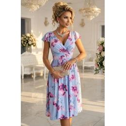425-14 MATILDE Blinkered midi šaty s obálkovým výstrihom a krátkymi rukávmi - modré s ružovými kvetmi