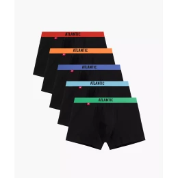 Päť športových boxeriek v elegantnej čiernej farbe, každé s iným farebným pásom - od svetlomodrej cez oranžovú až po sýtočervenú. Boxerky majú moderný nízky strih a pás zakončený mäkkou, netlačiacou gumičkou s logom Atlantic. Boky majú štandardnú dĺžku, takže padnú každému mužovi.