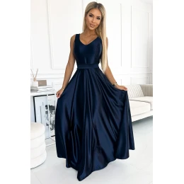 Cindy - dlhé saténové maxi šaty s výstrihom a mašľou. vyrobené z na dotyk lesklého materiálu v módnej tmavomodrej farbe. zapínajú sa vzadu na krytý zips. poľský výrobok. značka numoco.