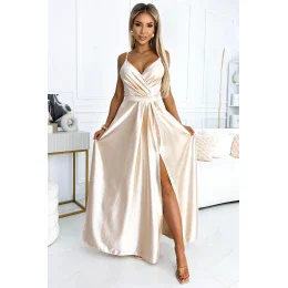 Juliet - elegantné maxi dlhé saténové šaty s rozparkom na nohách a opaskom. Krásne tvarovaný výstrih a rozparok na sukni vytvára nezvyčajnú kompozíciu. Vyrobené z lesklého, hladkého, mierne elastického saténu v béžovej farbe. Šaty sú ideálne na svadby, Silvestra, plesy, karnevaly a iné významné udalosti. Vyrobené v Poľsku spoločnosťou Numoco.