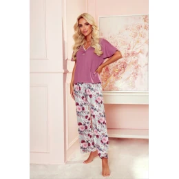 Dámske pyžamo z viskózy. Tričko s krátkymi rukávmi a výstrihom. Dopĺňajú ich voľné nohavice s rovnými nohavicami.