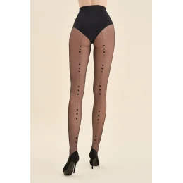 Elegantné pančuchové nohavice Amori 20 denier sú ponukou pre ženy, ktoré chcú jemne, ale účinne zdôrazniť svoju ženskosť. Čierne, klasické pančuchové nohavice na prednej strane a zmyselný, ozdobný šev na zadnej strane vytvárajú harmonický celok. Vzor v podobe srdiečok popretkávaných drobnými bodkami priťahuje pozornosť, opticky zoštíhľuje siluetu a dodáva romantický šarm každému stylingu.