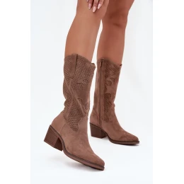 Ażurowe Kozaki Kowbojki Damskie Na Obcasie Ciemnobeżowe Olivette