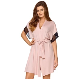 Ľahký dámsky župan od obľúbenej značky Babella v púdrové farbe je vyrobený z príjemného ľahkého materiálu, má krátky rukáv s transparentnou čiernou aplikáciou, v páse je opasok na sťahovanie a dĺžka do pol stehien.