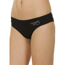Dámske brazilky značky Lovelygirl. Veľmi obľúbené brazilky v bielej, šedej alebo čiernej farbe sú vyrobené z bavlny a modalu (prírodné vlákno v základe vyrábané z bukového dreva, ktoré dodáva látke dokonalú pružnosť, jemnosť a hodvábny lesk, a ani pri opakovanom praní nohavičky nestráca tieto úžitkové vlastnosti). Vlákno modalu má dokonalú nasiakavosť a schopnosť rýchlo odvádzať pot od povrchu tela, čo oceníte pri celodennom nosení. V prednej časti majú brazilky nažehlené blyštivé kamienkami loga Lovelygirl. Zadná časť nohavičiek je prestrihnuté a dokonale sedí na zadočku. Vnútri nohavičiek je vsadený bavlnený klin. Nohavičky sú na dotyk hladké a veľmi príjemné.