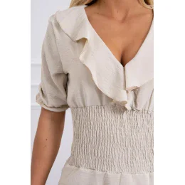 Predstavujeme vám módne šaty. Šaty do pása s výstrihom do V a volánikmi. Šaty sú vyrobené z vysoko kvalitného materiálu. Ideálne na letné dni. Veľkosť je univerzálna a vyhovuje dámam, ktoré nosia veľkosť S, M alebo L.
