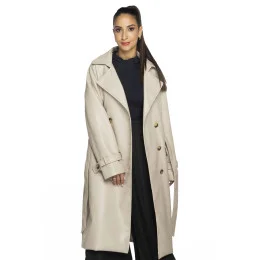 Béžový dvojradový klasický dámsky kabát z ekologickej kože AnnGissy (AG6-30)