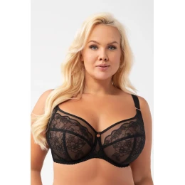 Mäkká podprsenka určená pre ženy so stredne veľkými, veľkými a veľmi veľkými prsiami, so zaobleným a nazbieraným efektom, 4-dielne košíčky s bočným panelom z vyšívaného stabilného tylu, zvýšený výstrih, zakončený lesklou stuhou, transparentná lycra na chrbte pre veľmi dobré prispôsobenie a podporu, bočné kostice zabraňujúce krčeniu látky, dvoj- alebo trojcestné zapínanie na háčiky a slučky v závislosti od veľkosti, neodnímateľné, nastaviteľné ramienka v štyroch šírkach, kovové prvky v ružovom zlate (neobsahujú nikel)