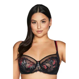 Mäkké košíčky so stabilným bočným panelom fantasticky zbierajú kostice pŕs k sebe a prirodzene ich zaobľujú. Jemná kvetinová výšivka obopína spodnú časť poprsia a šplhá sa k hornej časti košíčkov, ktoré sú podšité čiernym tylom a lemovaním. Ozdobný bufet zakončený charakteristickou mašľou v strede dodáva podprsenke ľahkosť, zatiaľ čo červené ramienka s lesklým krúžkom umiestneným na ramienkach priťahujú pozornosť.