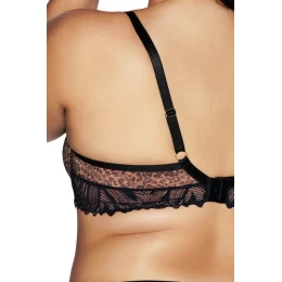 Košíčky z polopriehľadného vzoru K-1030 tvoria harmonickú kompozíciu s bodkovaným úpletom, bohato tkanou čiernou čipkou a jemným tylom telovej farby. Tieto prvky dokonale tvarujú poprsie, dodávajú mu príťažlivý vzhľad a zdôrazňujú ženské krivky. Dvojdielny obvod nielenže drží poprsie na mieste, ale dodáva mu aj jemný pôvab.