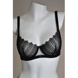 Mäkká podprsenka typu balconette v klasickej čiernej farbe, ideálna pre ženy s menšími a stredne veľkými prsiami. Košíčky z jemnej, decentnej čipky, zdobené štýlovým vzorom, zvýrazňujú prirodzený tvar pŕs a zároveň im dodávajú eleganciu. Konštrukcia s jedným švom v spodnej časti košíčkov zaisťuje pohodlné nosenie a mierne nadvihuje poprsie. Bavlna s ozdobnou sponou dodáva celku jedinečný charakter. Obvod je vyrobený z elastickej kabaretnej sieťoviny, bez bočných veľkých kostíc. Ramienka sú nastaviteľné, čo umožňuje ideálne prispôsobenie postave. Dvojité zapínanie na háčiky a očká zaisťuje stabilitu a pohodlie pri nosení. Ideálna voľba na každodenné nosenie aj na výnimočné príležitosti.