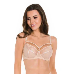 Mäkká podprsenka, sieťované košíčky v béžovej farbe s čipkou všitou do vrchnej časti.