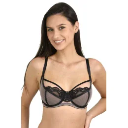 Vrchná časť košíčkov je zdobená jemnou výšivkou. Košíčky sú vyrobené z dvoch vrstiev sieťoviny. V spodnej časti má sieťovina čiernu farbu a hore farbu mocca. Vďaka farebnému prevedeniu podprsenka nepresvieti. Model zdobia regulátory a ozdoba v strede podprsenky vo farbe "golden rose". Pekný komplet je možné vytvoriť s plnými nohavičkami alebo nohavičkami typu brazílky.