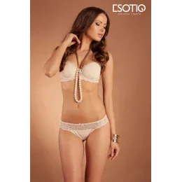 Pôvabná podprsenka s push-up efektom, ktorá dokonale pozdvihne a zväčší prsia a vytvorí sexy dekolt. Košíčky sú vyrobené z jemnej látky v béžovom odtieni, pokryté sladkým zlatým hráškom. Horná línia modelu je zvýraznená jemnou čipkou. Podprsenka má kostice a push-up výplň, ktorú je možné v prípade potreby vybrať. Čipkové boky, ktoré dodávajú ľahkosť. Uprostred šálok je umiestnený zirkónový prívesok. Odnímateľné ramenné popruhy. Značku Esotiq odporúča Joanna Krupa.