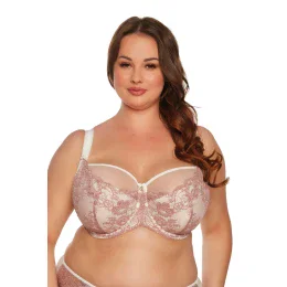 Polovyztužený model Ranita MAXI, kde vrchná časť košíčkov je vyrobená z ľahkého, svetlého, mliečneho tylu lemovaného stuhou. Spodná časť košíčkov, boky, stred a otvor na ramienka sú vyrobené z elastickej, ružovej čipky. Zadná časť je vykrojená, vyrobená z ľahkého mikrovlákna.