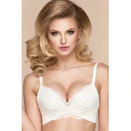 Push-up podprsenka bez kostice. Termoformované košíčky zdobené čipkou a jemne zdobené riasením. Nízky mostík odhaľuje dekolt a dodáva prsiam okrúhly tvar. Boky z dvojitej tylovej sieťoviny vystužené zvislými veľrybími kosticami, zapínanie na tri rady háčikov.