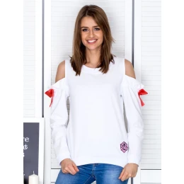 Mikina s prestrihmi na ramenách a mašľami biela .
