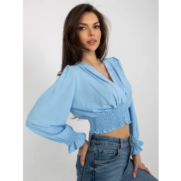 Svetlomodrá spoločenská blúzka s buffovými rukávmi.