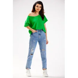 Voľné tričko s hlbokým výstrihom a lodičkovým výstrihom, ktorý sa dá pretiahnuť cez jedno rameno a vytvoriť tak rôzne štýly. Vyrobené v Poľsku.