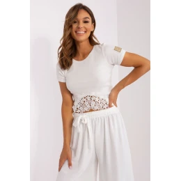 Krátka blúzka z rebrovaného materiálu, s krátkymi rukávmi a okrúhlym výstrihom. Čipková vsadka na prednom leme.