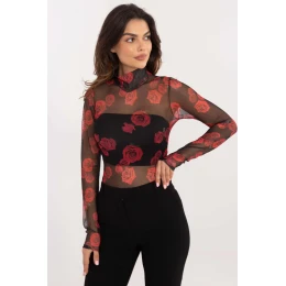 Elegantný a sexi top zajtrajška, ideálny na každú príležitosť. Priliehavý strih zvýrazňuje postavu a jemná sieťovina dodáva tajomnosť. Rolovaný výstrih chráni pred chladom a dodáva eleganciu. Dlhé rukávy zaručujú pohodlie a eleganciu. Kvetinový vzor dodáva topu romantický charakter a nechá vás vyniknúť z davu. Elastický materiál sa prispôsobí telu a zaručuje úplnú voľnosť pohybu. Top je priehľadný. Modelka má na sebe čierny top.