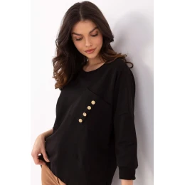 Elegantný a pohodlný top na každý deň z kvalitnej bavlny s prídavkom elastanu. Model z hladkého materiálu s okrúhlym výstrihom a 3/4 rukávmi poskytuje pohodlie pri každodennom nosení. Dĺžka topu sa dobre kombinuje s džínsami aj elegantnými nohavicami. Na prednej strane sa nachádza praktické vrecko zdobené ozdobnými gombíkmi, ktoré dodáva jemný šarm.