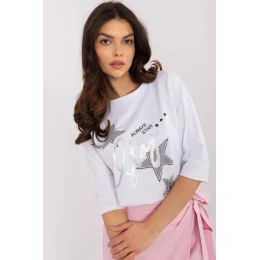 Elegantná blúzka na každý deň v štandardnej dĺžke vyrobená z kvalitnej bavlny s prídavkom elastanu pre pohodlie a skvelý strih. 3/4 rukávy modelu s okrúhlym výstrihom sú univerzálnou voľbou na každú príležitosť. Dominantný vzor kombinuje potlač s nápismi, čo dodáva blúzke módny a moderný charakter. Ozdobné štrasové kamienky na prednej strane dodávajú jemný lesk, čím podčiarkujú výnimočný štýl. Ideálna na každodenné nosenie, hodí sa k džínsom aj elegantným nohaviciam alebo sukniam.