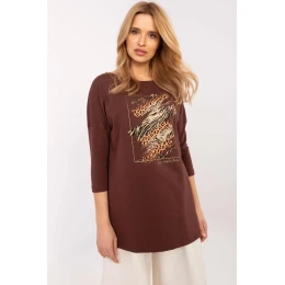 Elegantná blúzka s predĺženým strihom, ideálna na každý deň. Je vyrobená z kvalitnej bavlny s prídavkom elastanu, poskytuje pohodlie a voľnosť pohybu. Model s dlhšou dĺžkou, 3/4 rukávmi a okrúhlym výstrihom sa dokonale hodí k rôznym štylizáciám. Dominantný vzor so zvieracím motívom na prednej strane jej dodáva moderný, osobitý charakter. Perfektne sa hodí k legínam, džínsom alebo priliehavým nohaviciam, ideálna pre ženy, ktoré ocenia pohodlie a štýl.