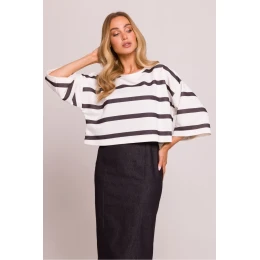 Táto krátka oversize mikina s prúžkovanou potlačou je ideálnou voľbou na každodenný outfit s nádychom pohodlia. Má široké rukávy v 3/4 dĺžke, ktoré jej dodávajú originálny vzhľad, a lodičkový výstrih, ktorý jemne zvýrazňuje ramená. Je vyrobená z mäkkého úpletu, ktorý zaručuje pohodlie a komfort počas celého dňa. Mikina bola navrhnutá a ušitá v Poľsku, čo zaručuje vysokú kvalitu a precízne spracovanie. Ideálne sa hodí na nosenie k džínsom, sukniam alebo športovým nohaviciam, je vhodná na každodenné aj elegantnejšie príležitosti.