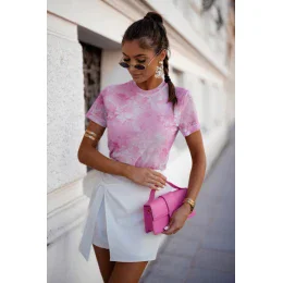 Táto tylová blúzka s krátkymi rukávmi je jedinečným kúskom šatníka, ktorý v sebe spája ľahkosť a eleganciu. Je vyrobená z mäkkého, polopriehľadného materiálu, jemne zvýrazňuje postavu a dodáva oblečeniu ženský nádych. Okrúhly výstrih dodáva oblečeniu klasický charakter a farebná potlač je pútavá a dodáva blúzke nezameniteľný vzhľad. Ideálna na každodenný život aj na výnimočné príležitosti, hodí sa k džínsom, sukniam alebo elegantným nohaviciam.