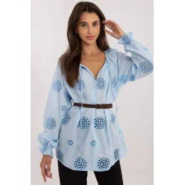 Táto blúzka na každý deň v boho štýle v sebe spája pohodlie a ženský pôvab. Je vyrobená z priedušnej prírodnej bavlny a je ideálna na každodenné nosenie. Model štandardnej dĺžky má ažúrový vzor, ktorý dodáva blúzke ľahkosť a jemnosť. Dlhé, nadýchané rukávy dodávajú blúzke výrazný a uvoľnený vzhľad. Výstrih s ozdobnými viazankami podčiarkuje romantický boho štýl. Je ideálnou voľbou k džínsom, sukniam alebo šortkám, skvele sa hodí na prechádzku alebo stretnutie s priateľmi. Súčasťou je pásik na zapínanie.