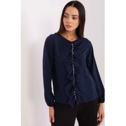 Elegantný top štandardnej dĺžky vyrobený z kombinácie polyesteru, viskózy a elastanu, ktorý poskytuje pohodlie a bezchybný vzhľad počas celého dňa. Hladká tkanina zdôrazňuje rafinovaný charakter modelu a zvislý volán na prednej strane zdobený drobnými korálkami dodáva jemný lesk a originalitu. Klasický okrúhly výstrih a dlhé rukávy dodávajú topu univerzálny, elegantný charakter. Bez zapínania sa model pohodlne nosí. Ideálny do práce aj na elegantné stretnutia.