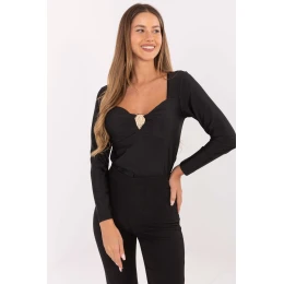Elegantná blúzka štandardnej dĺžky vyrobená z prevažne zmesi viskózy a polyesteru, ktorá spája pohodlie pri nosení s jemnou eleganciou. Model má hladké vyhotovenie a ženský výstrih v tvare srdca, okolo ktorého je ozdobný kovový prvok a jemné riasenie, ktoré celku dodáva osobitý charakter. Vložené vystužené košíčky zabezpečujú ideálne prispôsobenie a podporu poprsia, vďaka čomu blúzka vyzerá veľmi elegantne aj bez ďalších kusov spodnej bielizne. Dlhé rukávy zdôrazňujú formálny štýl a vďaka absencii zapínania je model pohodlný a praktický. Skvelý návrh na slávnostné príležitosti, obchodné stretnutia alebo elegantné vychádzky.