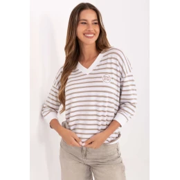 Dámsky pruhovaný top Casual s aplikáciou vpredu je pohodlný a štýlový dizajn na každodenné príležitosti. Je vyrobený z mäkkého mikromodalu s prídavkom elastanu, čo zaručuje pohodlie a voľnosť pohybu počas celého dňa. Model so štandardnou dĺžkou, 3/4 rukávmi a výstrihom do V kombinuje klasický strih s moderným detailom aplikácie, takže je ideálny na každodenné outfity s nohavicami aj sukňami.