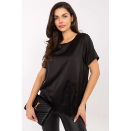 Elegantná a ženská blúzka so šik charakterom, ktorá sa skvele hodí na každodenné nosenie, ako aj do práce alebo na stretnutia. Je vyrobená z vysokokvalitnej zmesi polyesteru a elastanu, je mäkká na dotyk, elastická a pohodlná na nosenie. Model štandardnej dĺžky má krátke rukávy a okrúhly výstrih, ktorý jemne zvýrazňuje krk. Hladký materiál jej dodáva univerzálnosť a čipkový lem na spodnom okraji dodáva celkovú jemnosť a elegantný akcent. Ideálna voľba pre ženy, ktoré ocenia klasický štýl s nádychom ženskej elegancie.